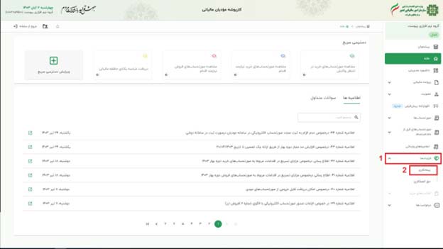 وارد کارپوشه مودیان شوید > از پنل سمت راست، منو قرارداد ها را انتخاب کنید (باکس شماره ۱) > گزینه “پیمانکاری” را انتخاب کنید (باکس شماره ۲)