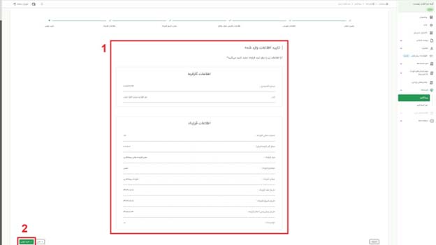 در این بخش کلیه اطلاعات وارد شده توسط شما و استخراج شده توسط سامانه جهت کنترل نهایی و تایید به شما نمایش داده میشود (باکس شماره ۱) اطلاعات را بررسی کنید و درصورت تایید با استفاده از گزینه “تایید نهایی” (باکس شماره ۲) فرایند ایجاد قرارداد را تکمیل و قرارداد را ایجاد کنید .