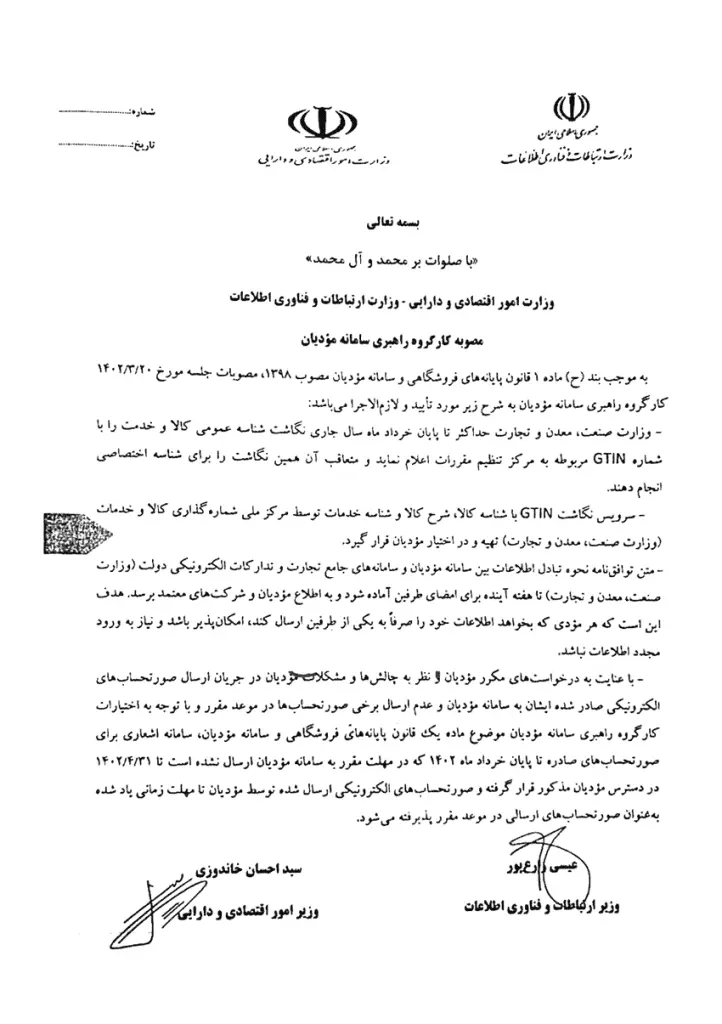 ⭕️ “با عنایت به درخواست مکرر اشخاص مشمول و با توجه به مصوبه مورخ ۱۴۰۲/۳/۲۰ کارگروه راهبری سامانه مودیان و اخذ مجوز لازم از مراجع ذیربط، مهلت ارسال و ثبت صورتحساب های الکترونیکی صادره از ۱۴۰۱/۸/۱ تا پایان خردادماه سال جاری تا تاریخ ۱۴۰۲/۴/۳۱ تمدید گردید