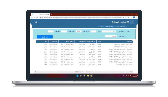 این گزارش اموال موجود در هر واحد را به مدیریت آن واحد نمایش می دهد. این اطلاعات می تواند به اختیار سازمان شامل اطلاعات و مشخصات دارایی و همچنین اطلاعات ریالی مانند ارزش دفتری باشد.