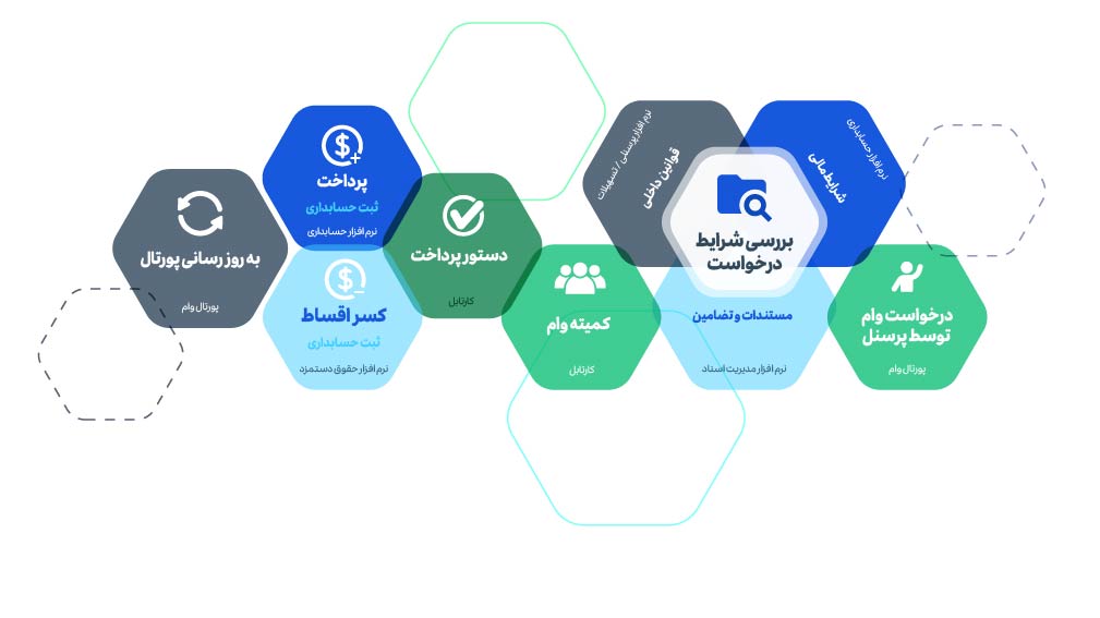 این نرم افزار، ابزار اصلی برای کسر اقساط وامهای پرداخت شده در ماههای مختلف پرداخت حقوق می باشد. اقساط وامهای پرداخت شده در فرآِند درخواست تا اعطای وام به پرسنل، در این نرم افزار ثبت شده و اقساط وام به صورت ماهانه کسر و سند حسابداری آن در نرم افزار حسابداری وام درج می گردد.