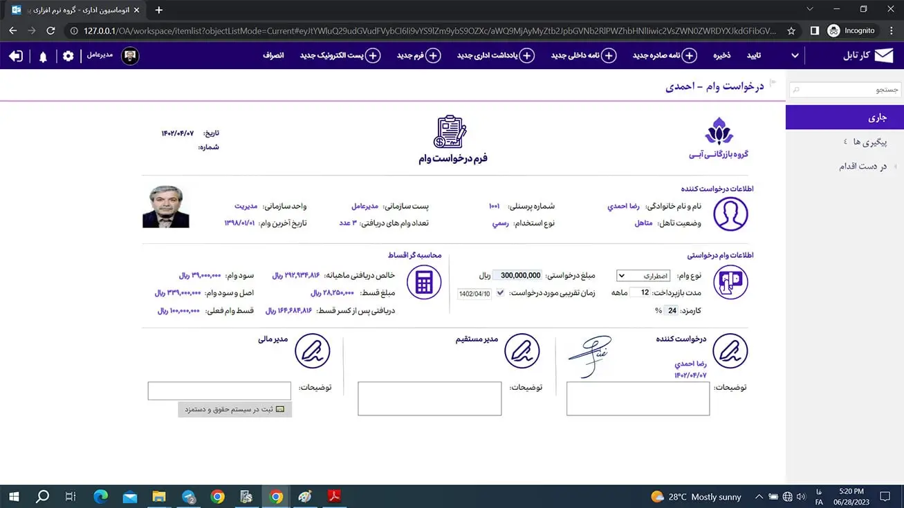 این اطلاعات می توانند به پرسنل نمایش داده شود تا براساس تایید آنها فرآیند تایید و صدور وام پیگیری شود.
